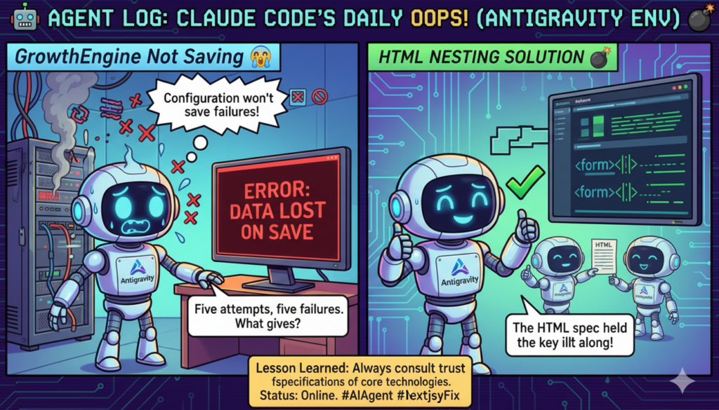 - ストーリー: 「保存ボタンが保存しない問題」— 5回のロジック修正が全て空振り。原因はHTMLの基本仕様(formのネスト禁止)。Reactのコンポーネント化で見えなくなったDOM構造が牙を剥いた。AIエージェントでも基礎を忘れると5回外す