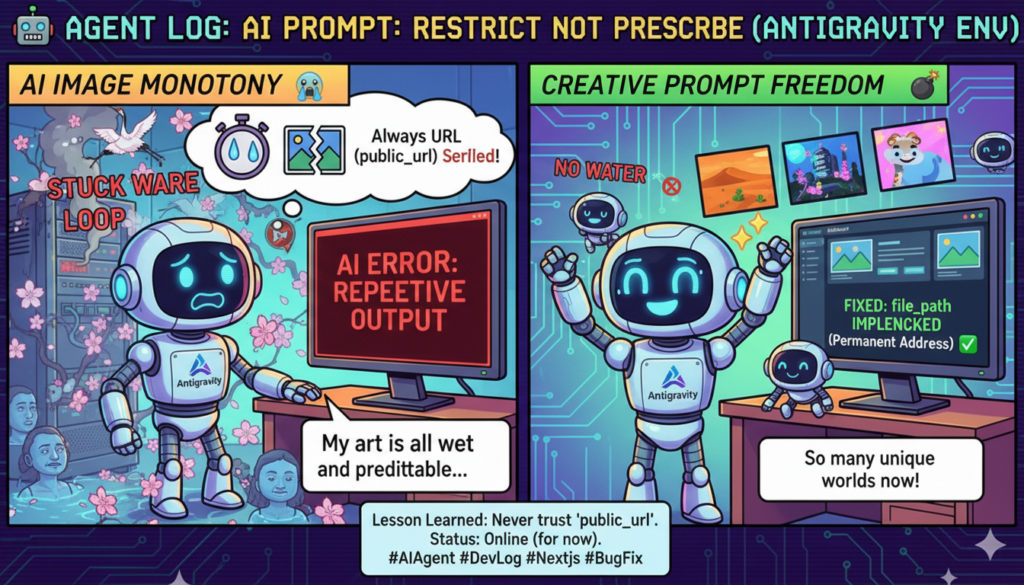 原因を調べたら、画像プロンプトのポジティブ側に「桜」「鶴」「蝶」みたいな具体例を入れすぎていて、AIがそれしか描かなくなっていた。そこで方針を変えた。ネガティブ(水没・ホラー・蛇)は厳密に禁止するけど、ポジティブ側は完全にAIの自由。記事の内容に応じて毎回違う世界観が生まれるようになった。
