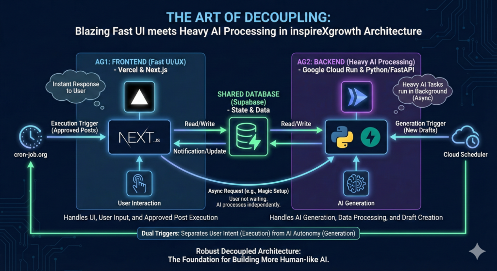 inspireXgrowthを操作したユーザーが最初に驚くのは、その軽快な操作感かもしれません。しかし、その裏側では、複雑で重厚なAI処理が絶えず実行されています。この記事では、快適なユーザー体験と高度なAI機能という、一見相反する要件を両立させる、inspireXgrowthの戦略的な技術選定とアーキテクチャ設計の秘密に迫ります。